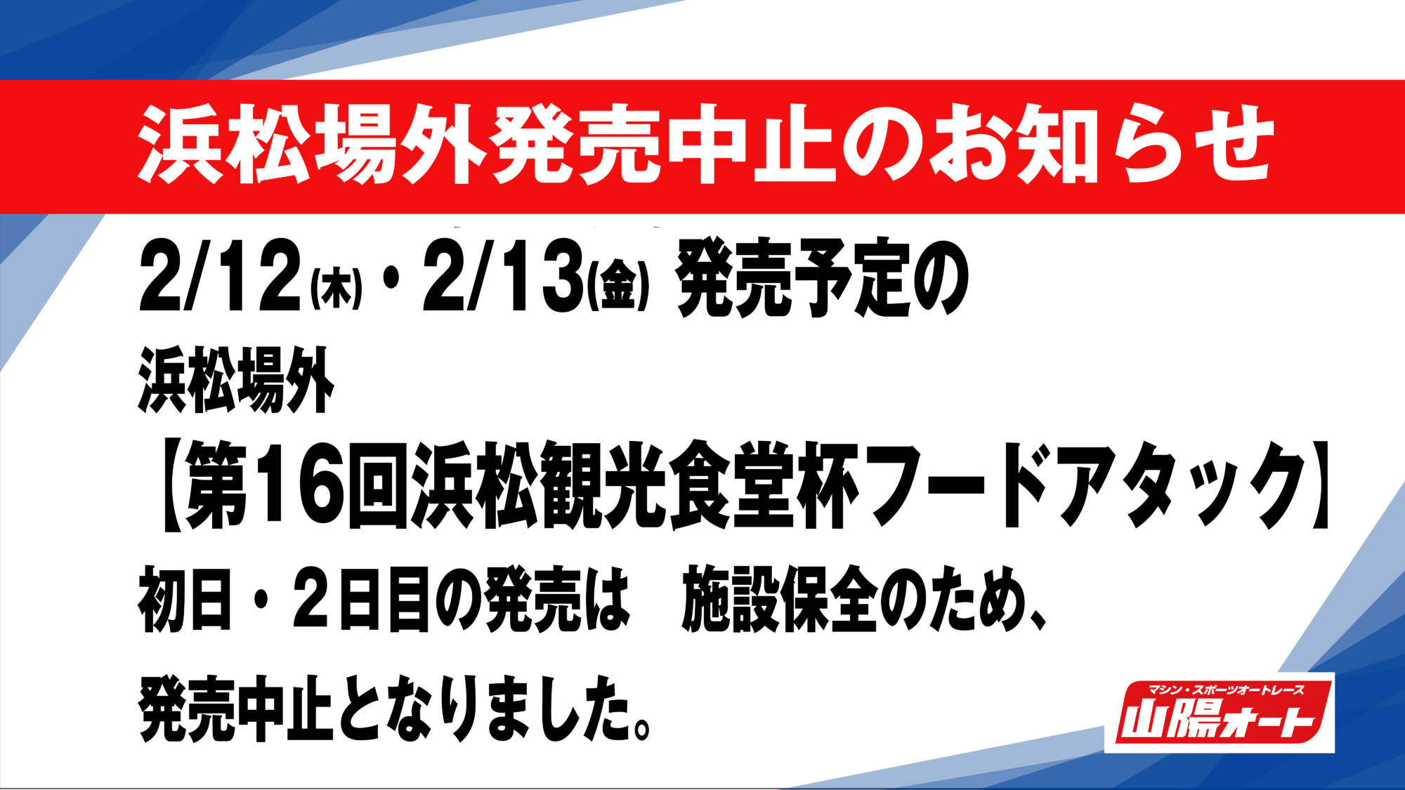 2月12日及び13日山陽オートレース場での場外発売中止について