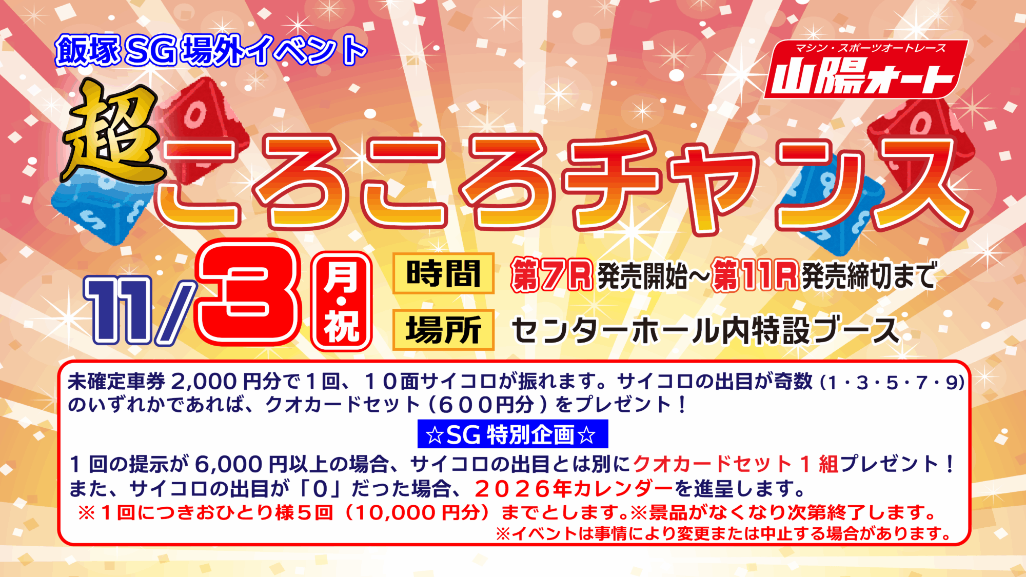 2025.10.25 イベント NEW 飯塚SG場外イベント告知 11月3日(祝)に山陽オートレース場内にて、場外イベント「超 ころころチャンス」を実施します。 詳細につきましては、下記画像をご確認ください。