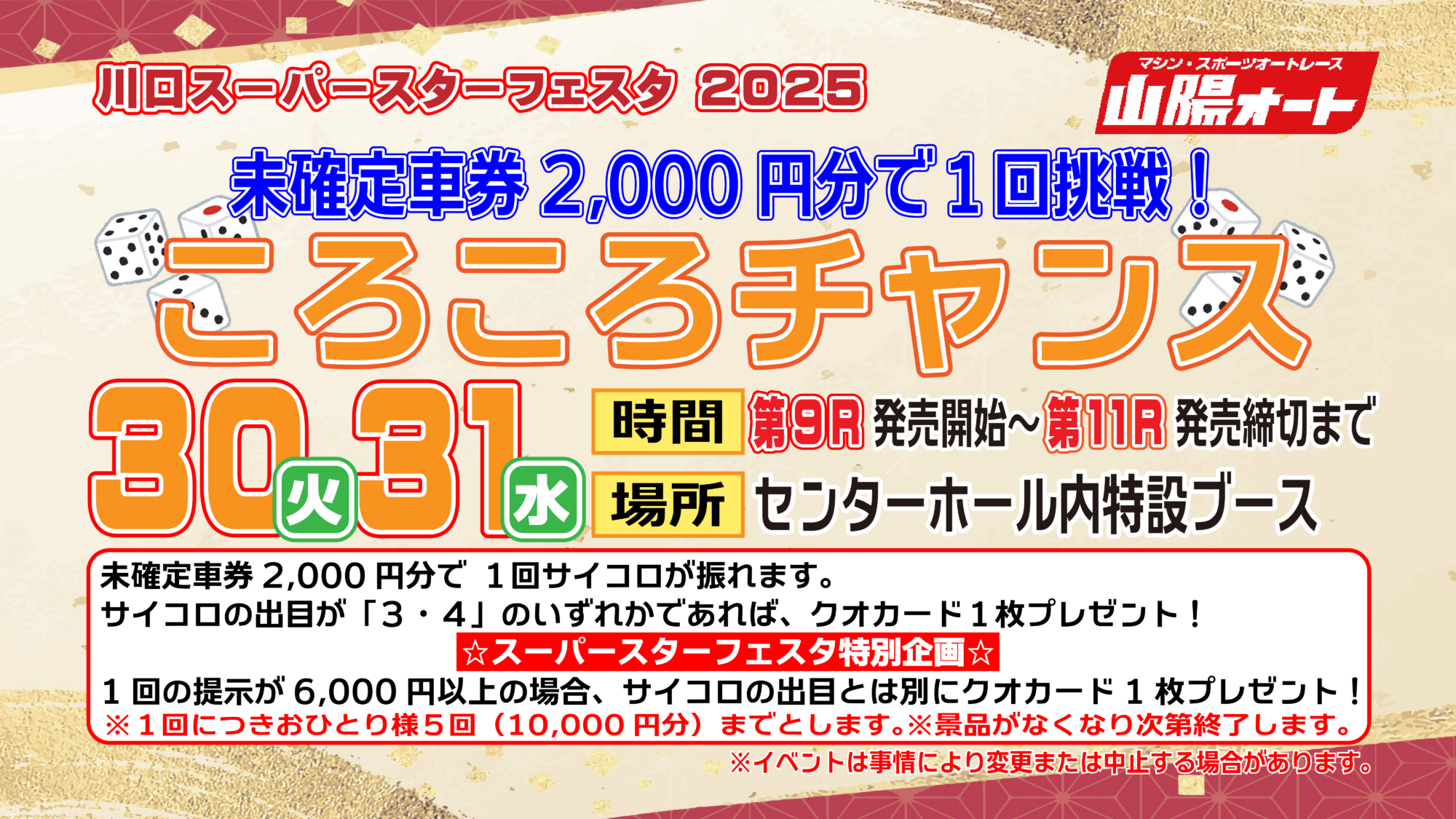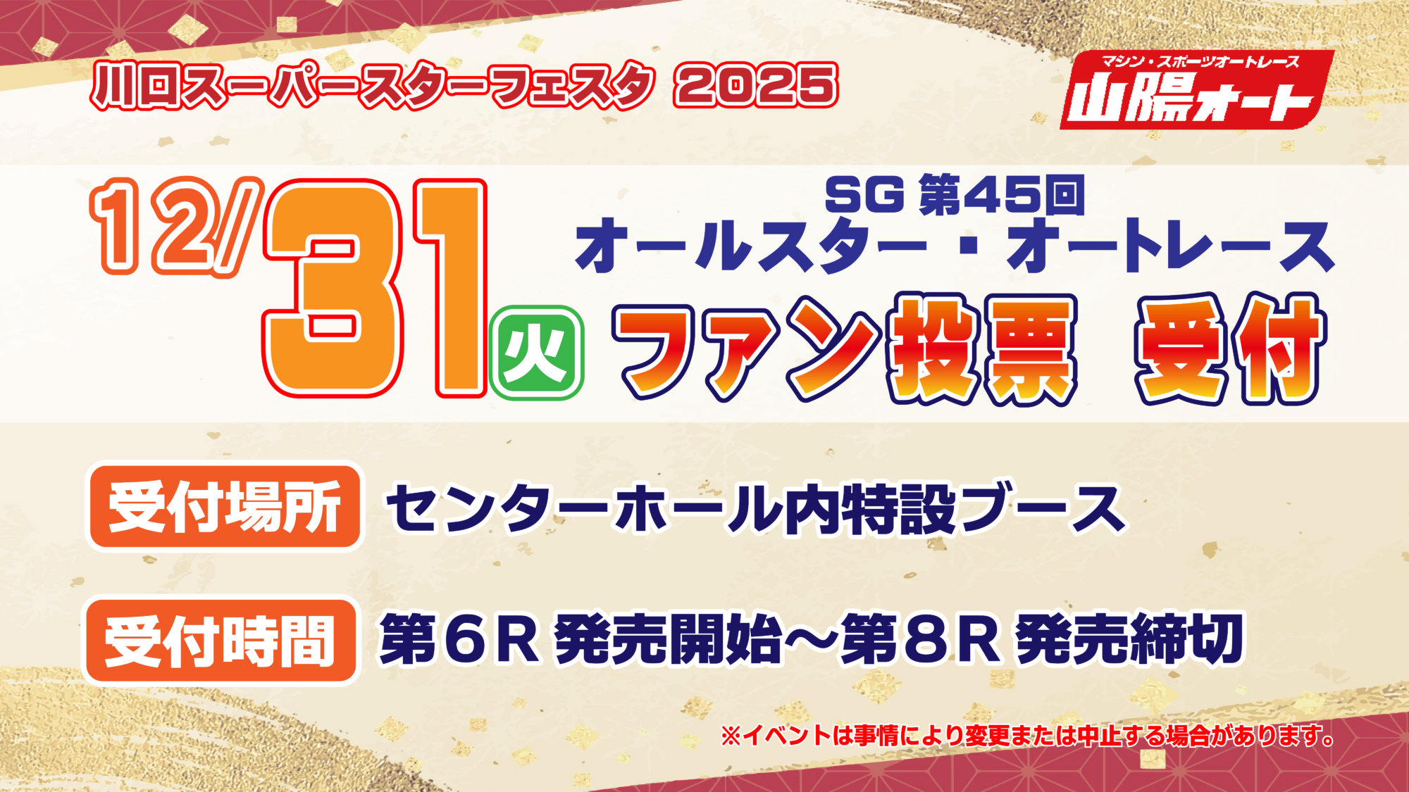 2025.12.29 イベント NEW 川口スーパースターフェスタ場外イベント告知 12月30日・31日に山陽オートレース場内にて、場外イベントを実施します。 詳細につきましては、下記画像をご確認ください。
