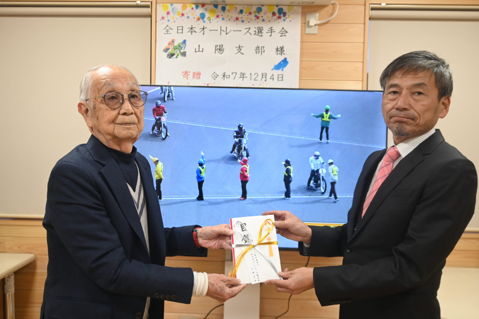 2025年12月4日(木)に一般社団法人全日本オートレース選手会山陽支部の角南 一如支部長と岡本 信一選手が山陽小野田市内の幼稚園・児童養護施設を訪問し、おもちゃや三輪車といった物品を寄贈しました。